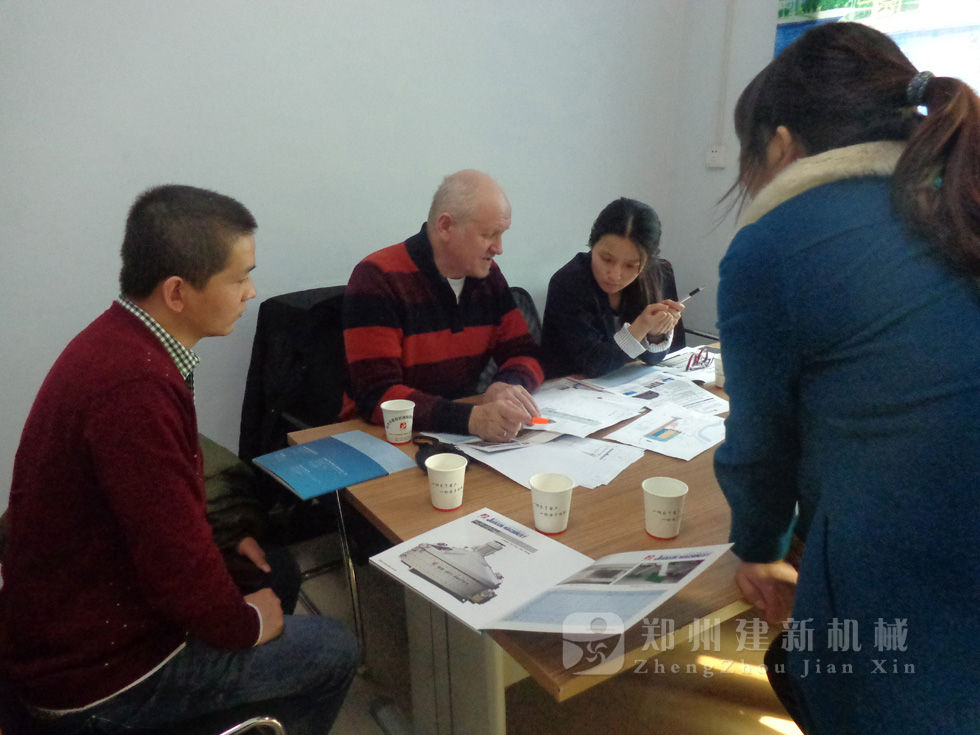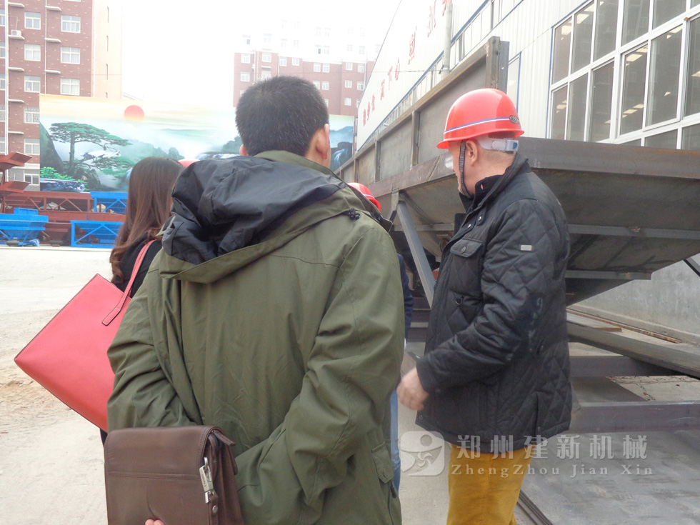 2014年11月,來自俄羅斯的客戶來到鄭州建新公司簽訂了兩套時產120方混凝土攪拌站設備的大訂單,下圖為建新公司銷售部劉經理、經理帶客戶參觀建新公司的生產車間及成品貨場。